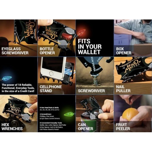 בארנק נינג׳ה תוכלו למצוא 18 כלי עבודה שונים המתאימים למגוון שימושים בחיי היום יום. פשוט שמים אותו אתכם בארנק והוא תמיד יהיה זמין לכל צרה שלא תבוא. ואפילו לקחת אותו איתך למטוס.