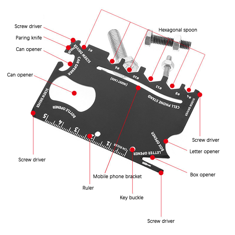 תחשבו שהייתם יכולים לקחת איתכם לכל מקום – פותחן קופסאות שימורים, סט מברגים בגדלים שונים, סרגל, קולפן פירות, מעמד לטלפון הנייד, פותחן מעטפות ועוד כלים רבים והכל במוצר אחד. אז מהיום זה אפשרי!