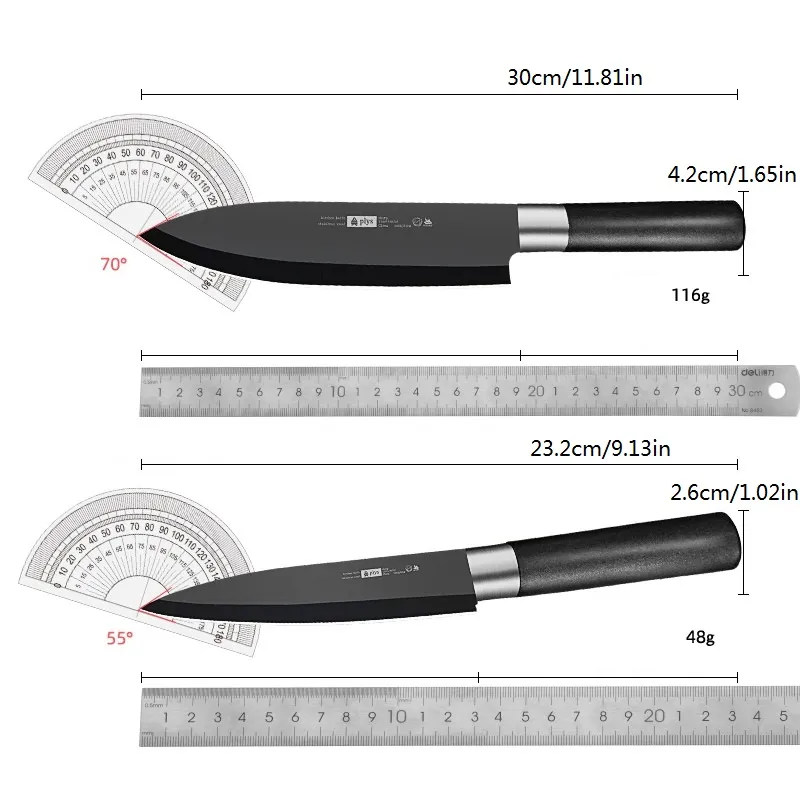 מפרט טכני: חומר: פלדת אל – חלד משקל: כ-48 גרם (סכין פירות) / 116 גרם (סכין שף) צבע: שחור