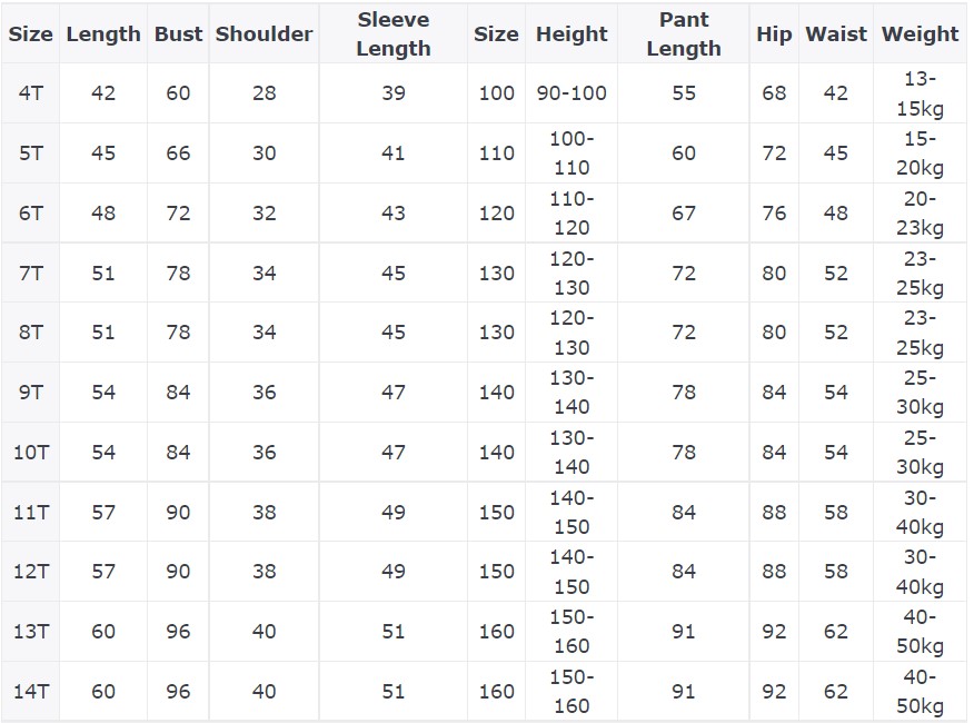 • מידות לבחירה – 4T-14T