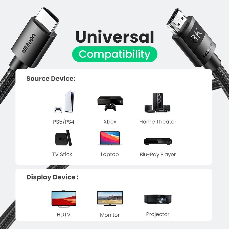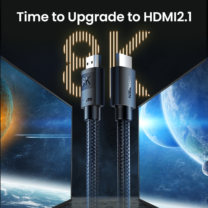 כבל HDMI 2.1 איכותי מבית Ugreen אשר מתאים למחשבים, כרטיסי מסך ומסכי גיימינג, תומך ברזולוציות גבוהות במיוחד של עד 8K בקצב של עד 60Hz או 4K בקצב של עד 120Hz. ה-HDMI 2.1 מסוגל להגדיל את רוחב הפס עד 48 ג'יגה לשנייה.