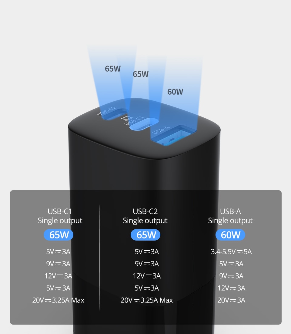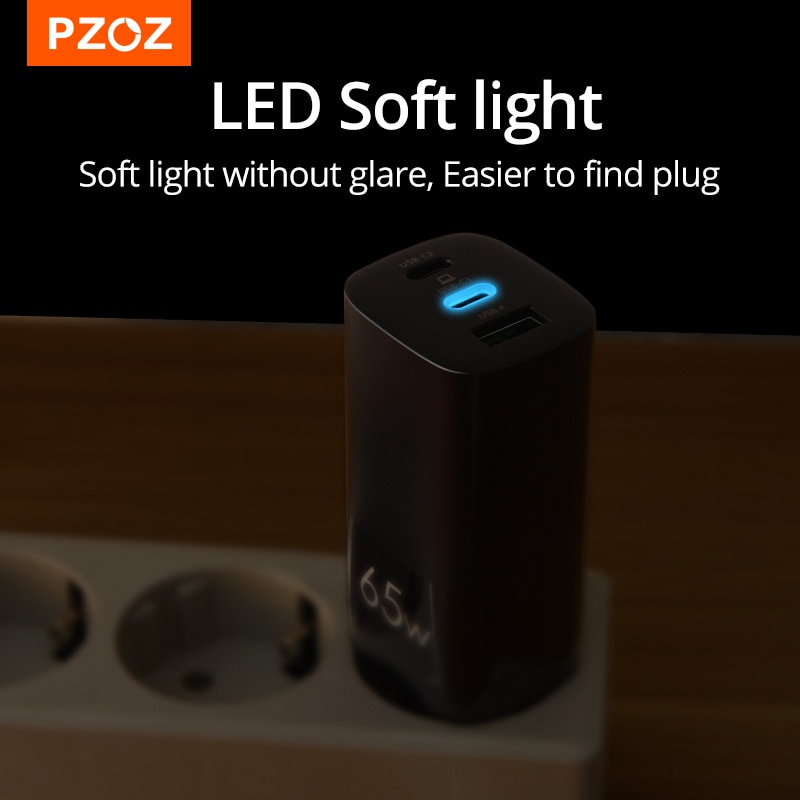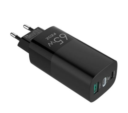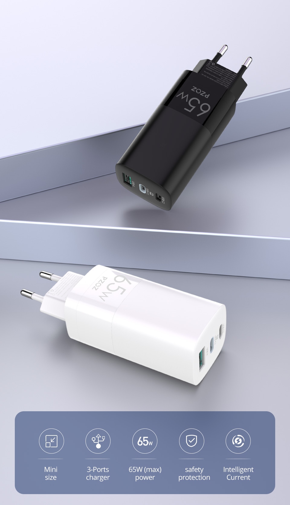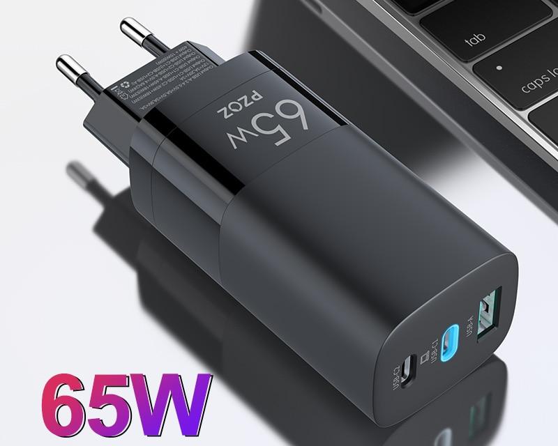 מטען סופר מהיר 65W בטכנולוגיית GaN + Sic מבית PZOZ עם 3 יציאות טעינה – שתיים Type-C/PD ואחת USB, קטן מימדים וקומפקטי במיוחד, תומך בכל טכנולוגיות הטעינה המהירות, מתאים גם ללפטופים.