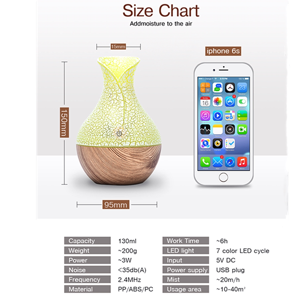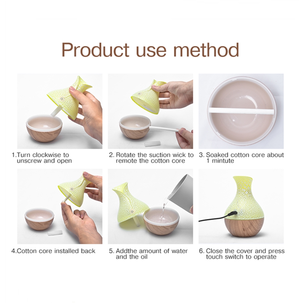 - לחיצה אחת והדיפיוזר יתחיל לעבוד עם 7 אורות לד מתחלפים, לחיצה נוספת הדיפיוזר יעבוד ללא אור ולחיצה נוספת לכיבוי.