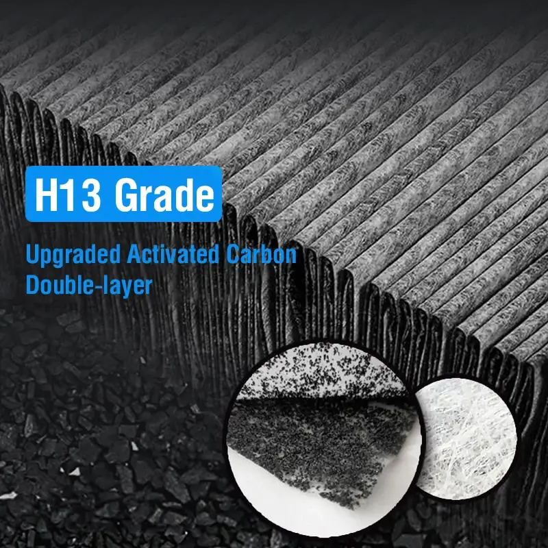 • יעילות גבוהה בשלוש שכבות: שכבת רשת סינון, שכבת HEPA, פחם פעיל