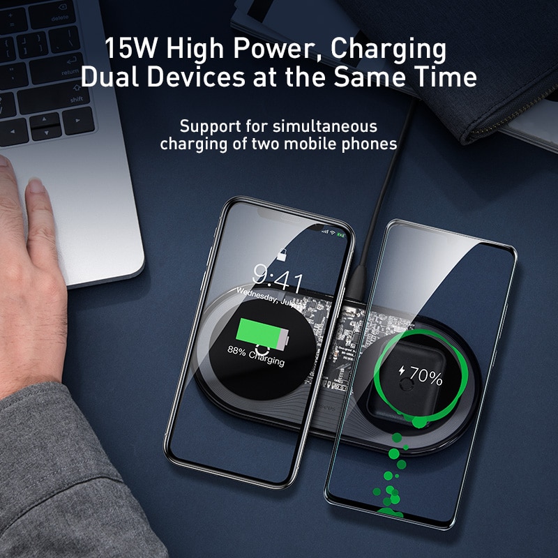 • מטען משטח טעינה כפול Baseus התומך בטעינה מהירה