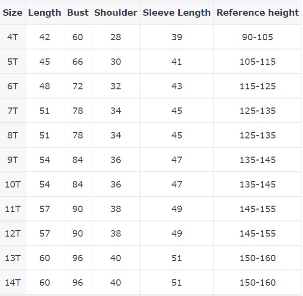 SizeLengthBustShoulderSleeve LengthReference height