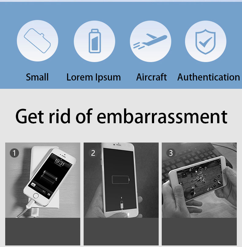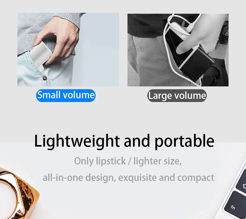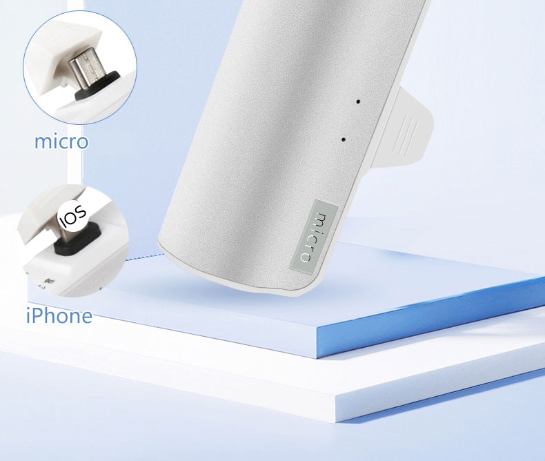 סוללת חירום לטלפון נייד ומכשירים נוספים קיבולת סוללה 3,300mAh רק 75 גרם כמו משקל של ביצה! 7.5 ס"מ בלבד בגודל של שפתון לא צריך להתעסק עם כבלים, פשוט לחבר ישירות לסמארטפון 3 מחברים/חיבורים לבחירה –