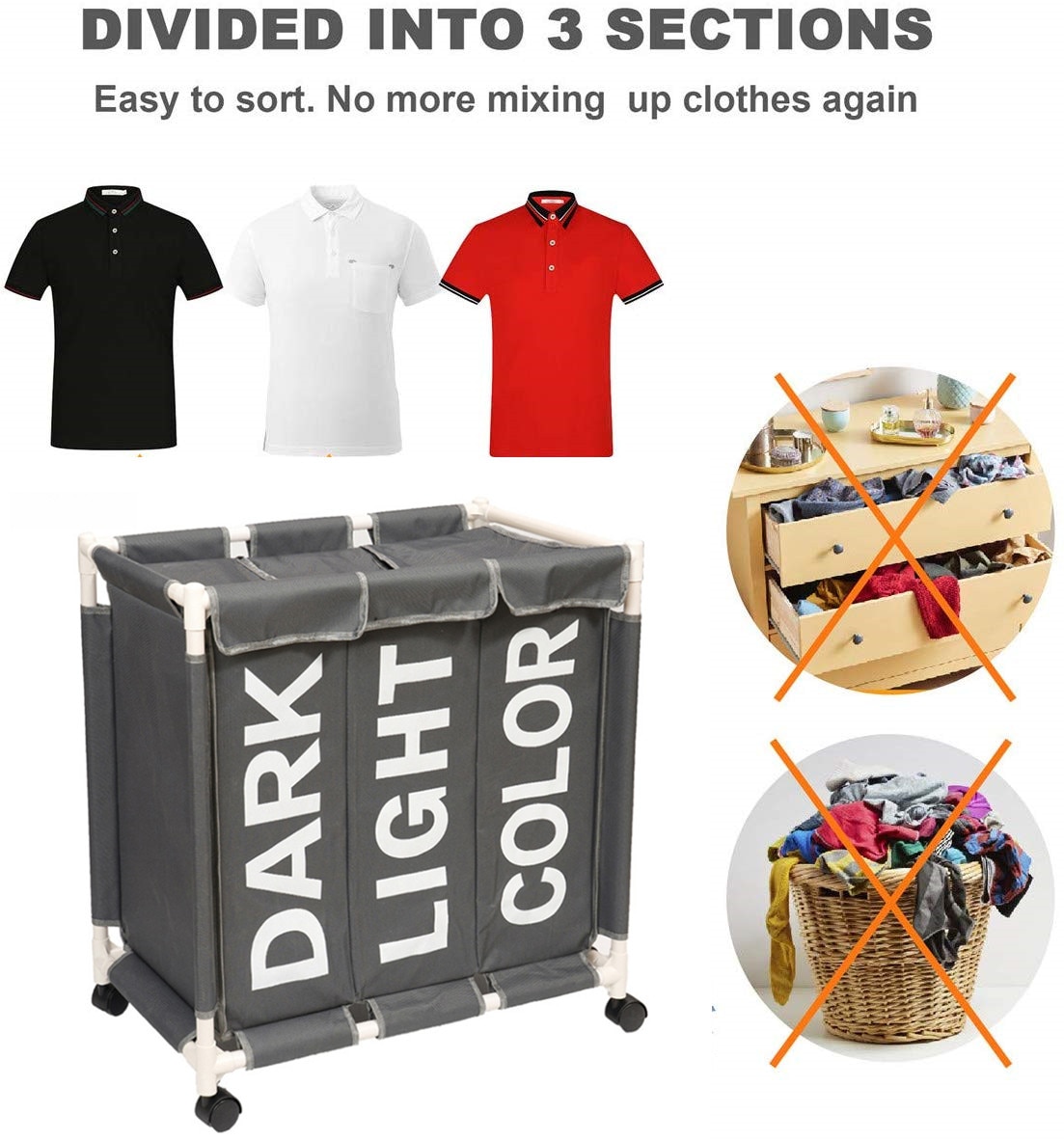 - סל כביסה 3 ב-1 – שלושה סלים שונים לבגדים: “בהירים”, “כהים” ו”צבעוניים” בכדי להקל על הפרדת הכביסה לפי סוגי הכביסה השונים.