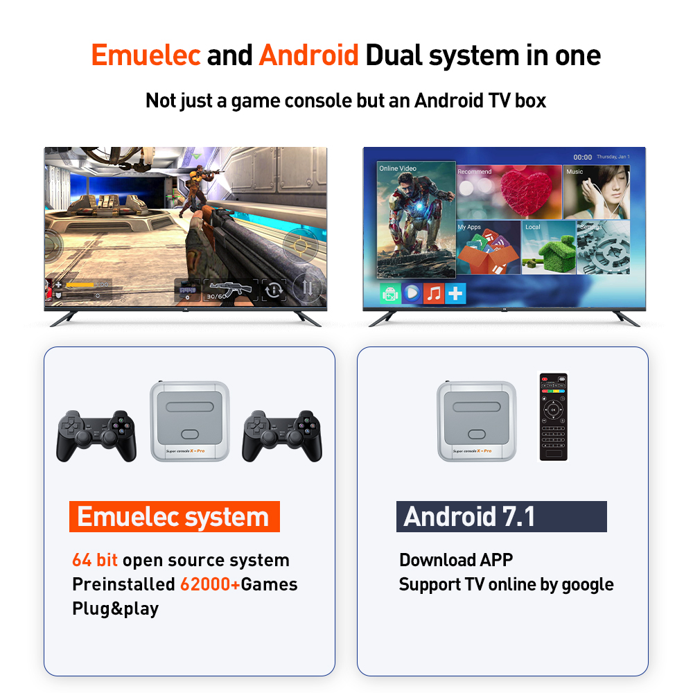 - מערכת הפעלה כפולה – EmuELEC + אנדרואיד במכשיר אחד שניתן בעזרתה להנות במשחקי הוידאו במערכת אחת, ולצפות כסטרימר במערכת השנייה.