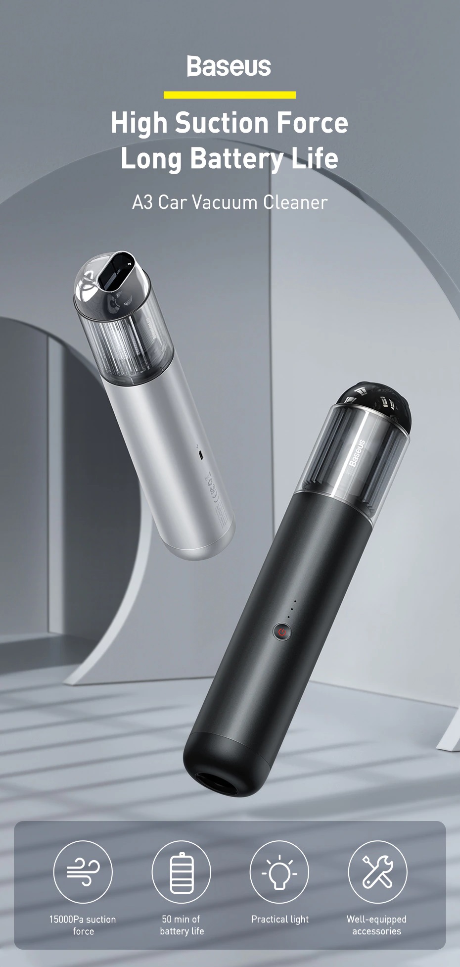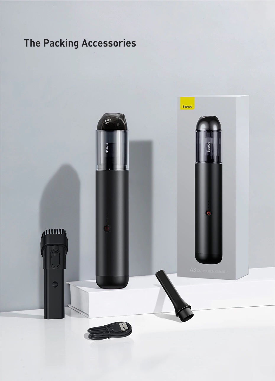 שואב לרכב ולבית מבית Baseus, שואב כף יד קומפקטי אך עוצמתי במיוחד! בעל הספק 135W ועוצמת שאיבה 15,000pa! פעולה חזקה אך שקטה במיוחד, רק כ-75dB עוצמת רעש!