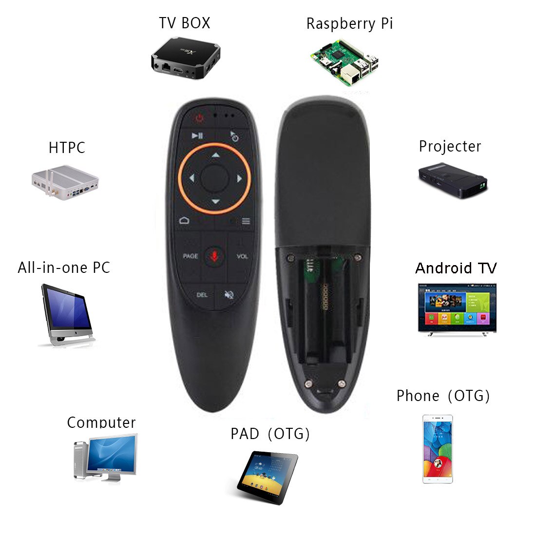 השלט עובד באמצעות פונקציות של air mouse (עכבר) וג’ירוסקופ – החיישן של הג’ירוסקופ 3-Gyro + 3-Gsensor מאפשר שליטה בשלט במצב אופקי או מאונך.