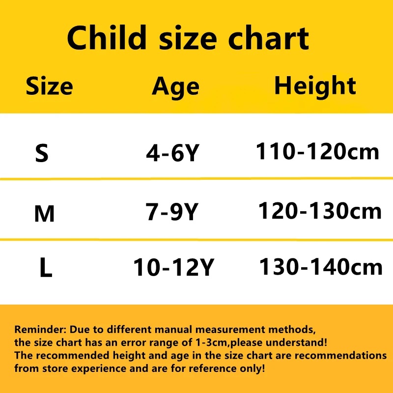 S – לגילאי 4-6 שנים , גובה מומלץ: 110-120 ס”מ M – לגילאי 7-8 שנים , גובה מומלץ: 120-130 ס”מ L – לגילאי 9-10 שנים, גובה מומלץ: 130-140 ס”מ