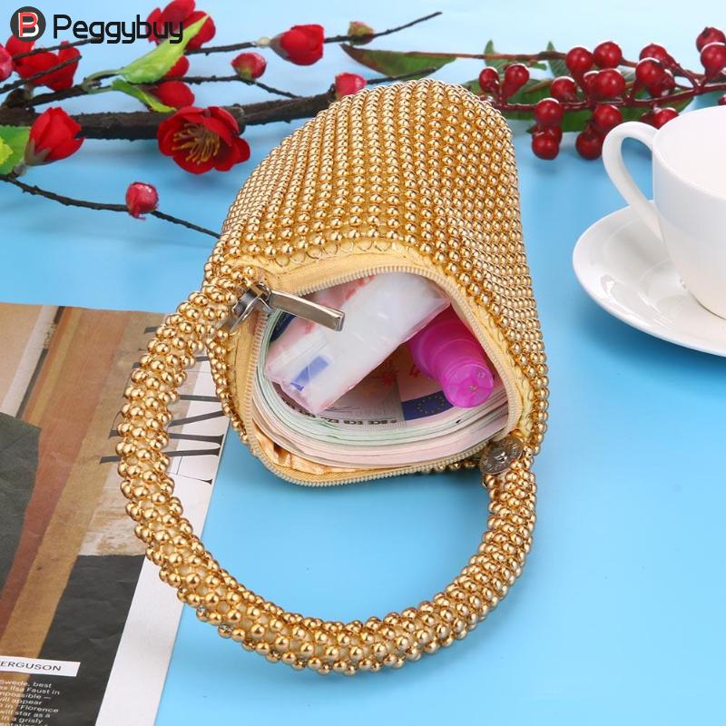 תיק קטן ויוקרתי לערב, עשוי בד ניילון וחרוזי מתכת שזורים.