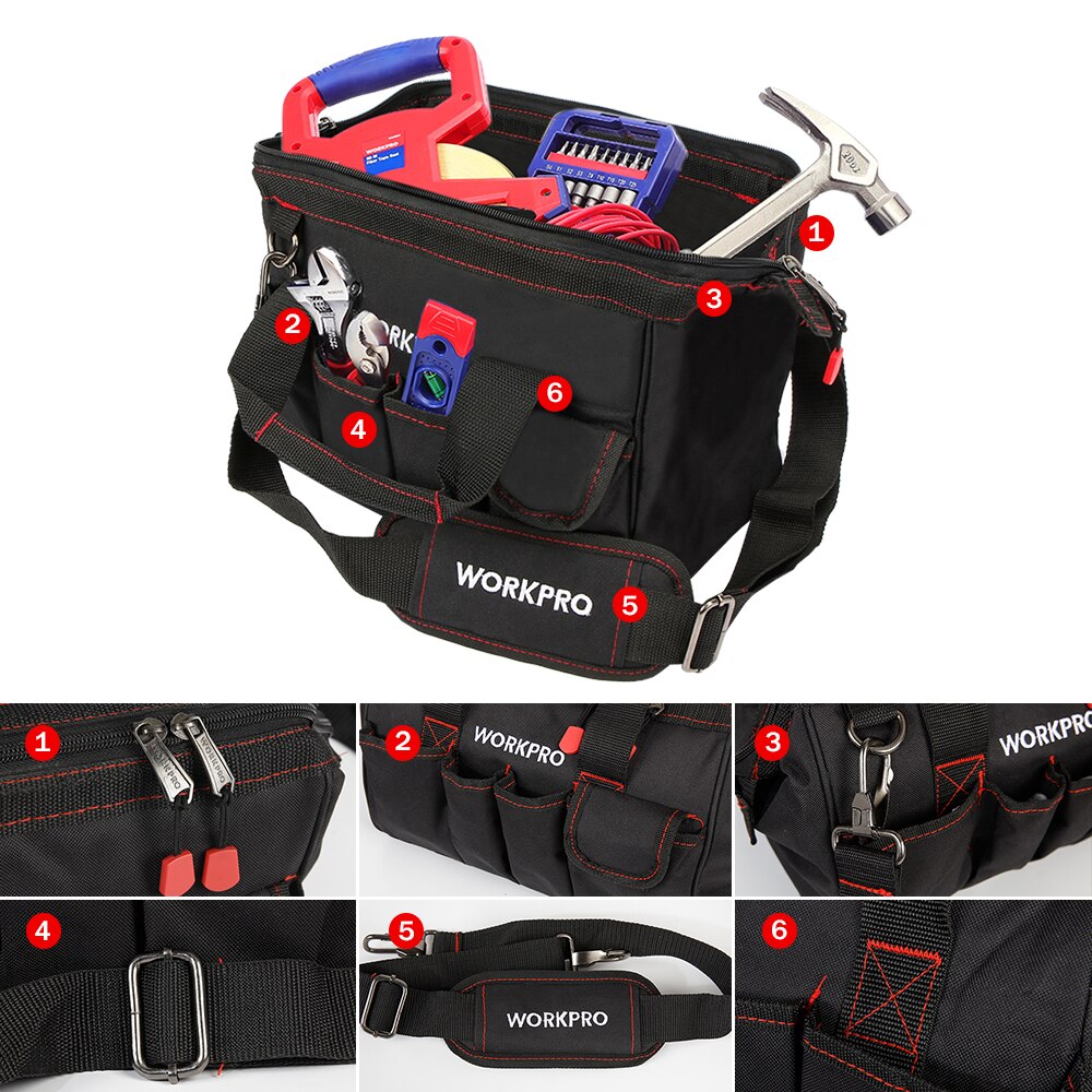 תיק נשיאה לכלי עבודה מבית WORKPRO עם ידיות אחיזה נוחות ורצועת נשיאה.