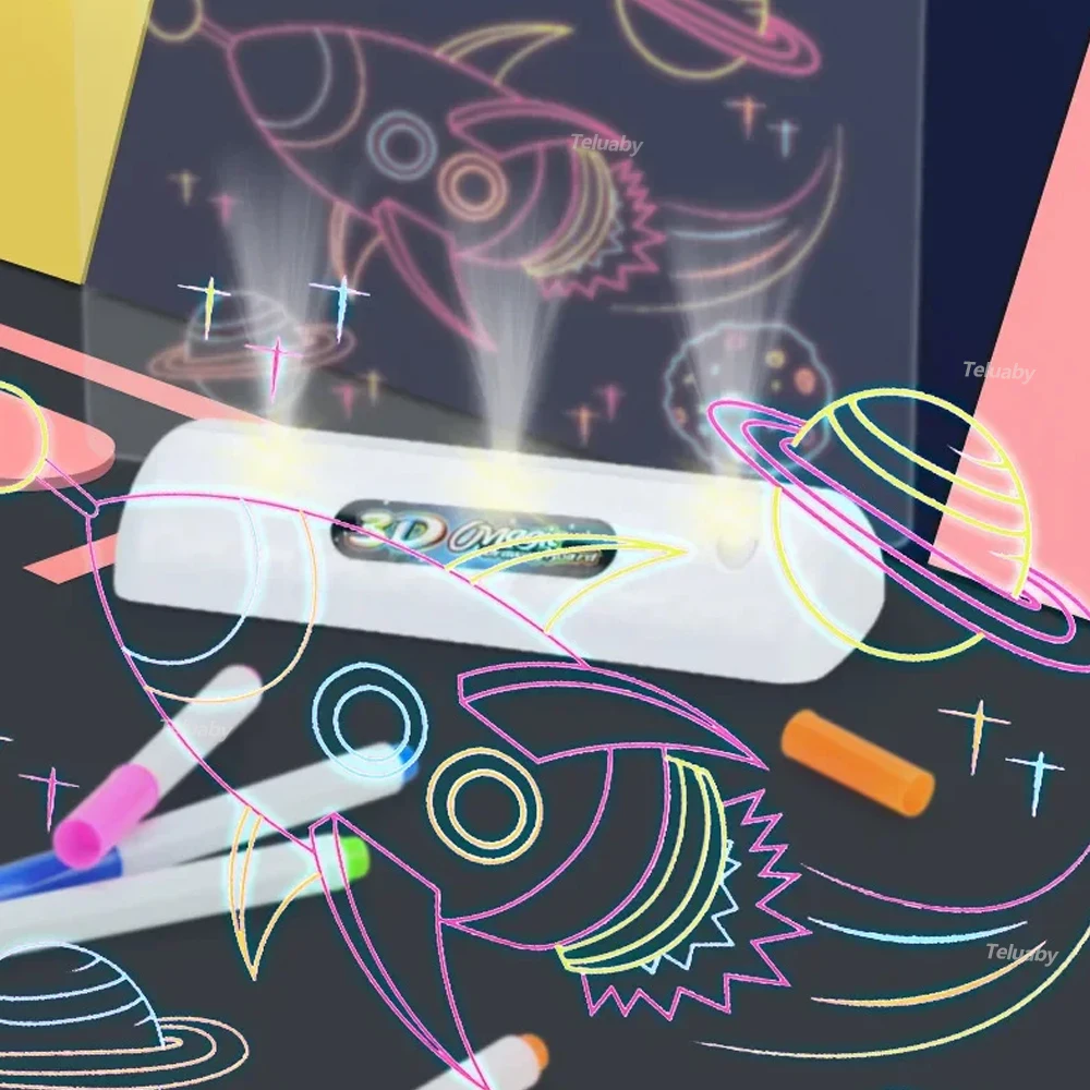 הלוח המואר עם הטושים הזוהרים מאפשר לילדים ליצור יצירות מרהיבות בתלת-מימד. רק הרכיבו את משקפי התלת-מימד המיוחדים וצפו בקסם מתרחש!