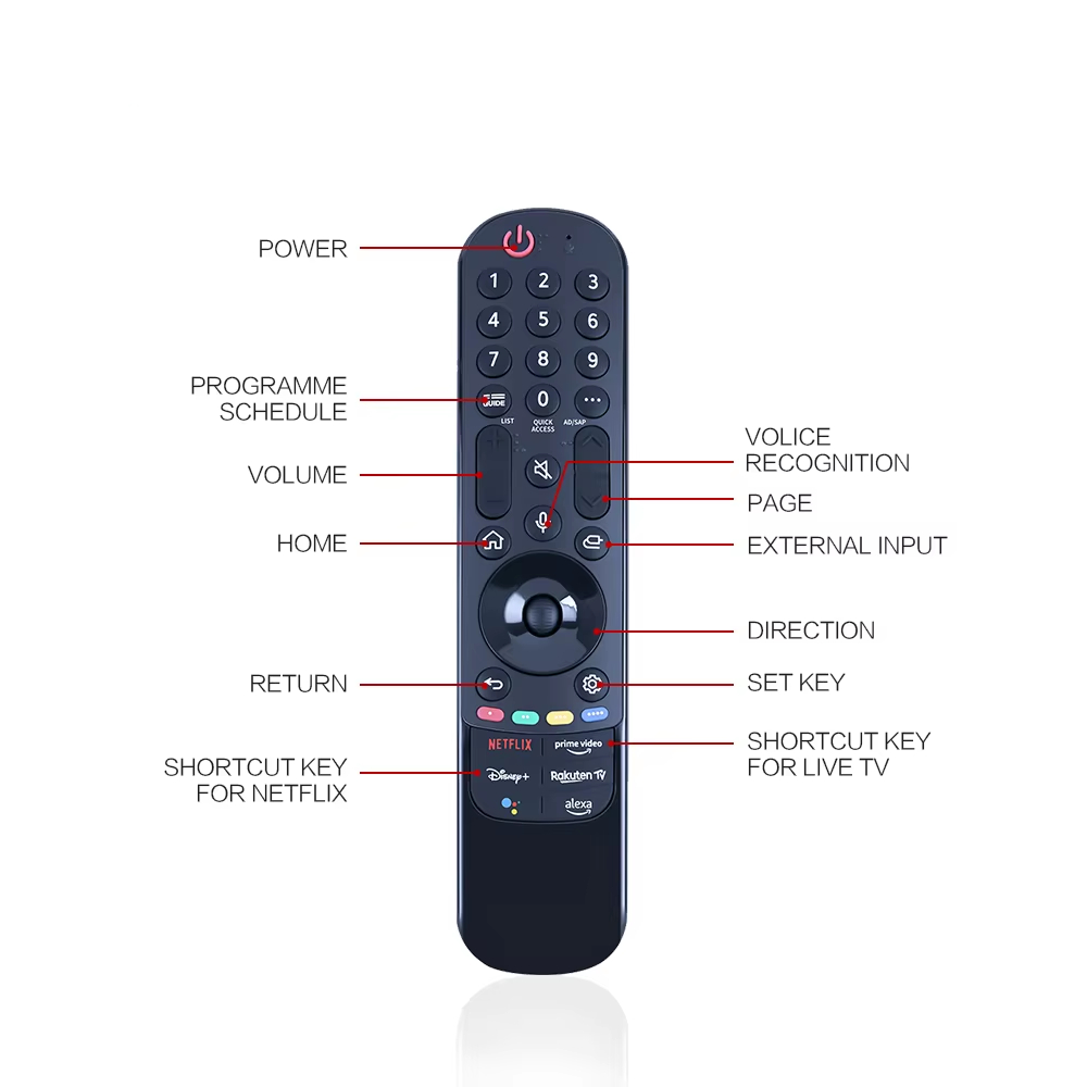 מחפשים פתרון מושלם לשלט שהתקלקל או הלך לאיבוד? הכירו את השלט החכם LG MR-22GA לדגמי טלויזיות 2019-2022 ומעלה! שלט זה מבטיח איכות מעולה ותפקוד מצוין לכל טלוויזיות LG החדשות. עם התמיכה בנטפליקס ושאר האפליקציות האהובות עליכם, תוכלו ליהנות מחוויית צפייה רציפה וללא דאגות. השלט מתאים בדיוק לטלוויזיות שהשלט המקורי שלהן נראה כך או דומה, ומבטיח לכם שימוש קל ואינטואיטיבי.