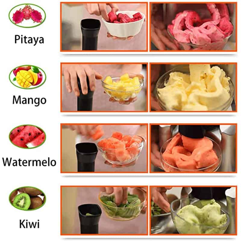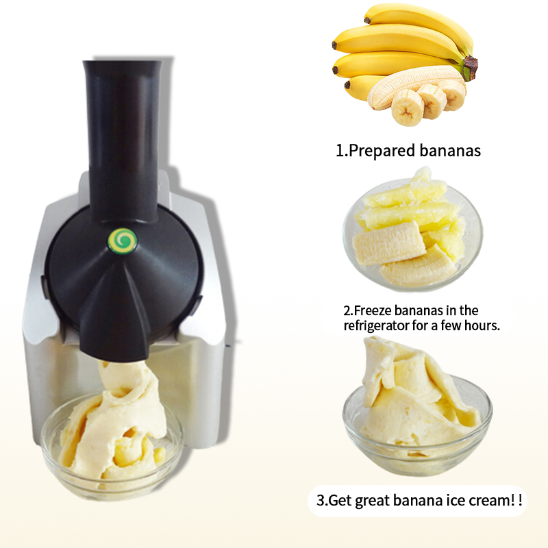 מקפיאים פירות קלופים. ברגע שמתחשק לכם גלידה, מכניסים למכשיר את הפירות הקפואים (בננה, מנגו, תפוז, אננס, אפרסמון וכו') והמכשיר הופך אותם במיידית לגלידה עם מרקם סמיך וטעים.